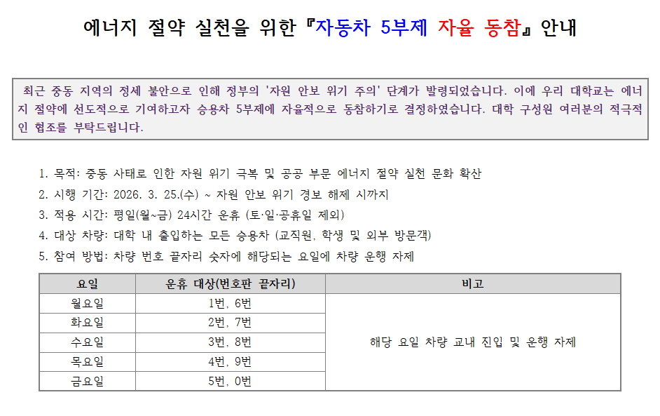 에너지 절약 실천을 위한 『자동차 5부제 자율 동참』 안내